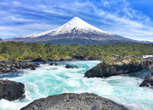 VOLCAN OSORNO cuya forma asombra por su perfección, un volcán activo con su cono de forma perfecta, En el trayecto se sorprenderá con la vista panorámica del valle del Río Petrohué y el hermoso Lago Llanquihue. Es un impresionante volcán activo ubicado en el sur de Chile, cerca de Puerto Varas. Con una cumbre cubierta de glaciares y un cono simétrico, ofrece impresionantes vistas. Se encuentra en el Parque Nacional Vicente Pérez Rosales, que también ofrece una variada belleza natural.