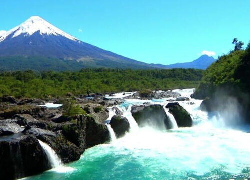 SALTOS DEL RIO PETROHUE son una serie de impresionantes caídas de agua en el Parque Nacional Vicente Pérez Rosales, en Chile. Formados por rocas volcánicas, enmarcan las aguas turquesas del río Petrohué y ofrecen un espectáculo natural impresionante. Con pasarelas y plataformas de observación, es un destino imperdible para los amantes de la naturaleza